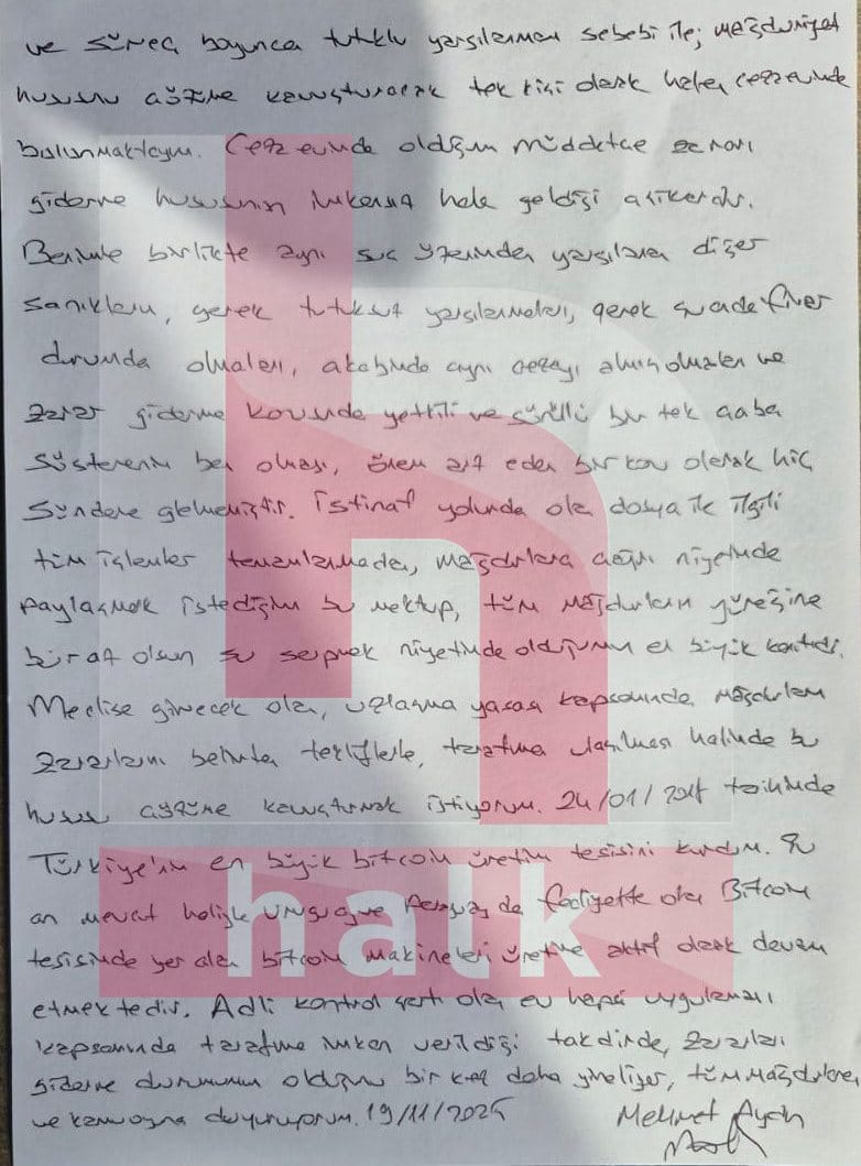Meclis’e gidecek olan uzlaşma yasası kapsamında mağdurların zararlarını belirtilen tekliflerle tarafıma ulaşması halinde bu husus çözüme kavuşturmak istiyorum. 24/01/2011 tarihinde Türkiye’nin en büyük bitcoin üretim tesisini kurdum. Bu mevcut haliyle Urugay ve Paraguay’da faaliyette olan Bitcoin tesisinde yer alan bitcoin makineleri üretime aktif olarak devam etmektedir. Adli kontrol şartı olarak ev hapsi uygulaması kapsamında tarafıma imkan verildiği takdirde de zararları giderme durumumun olduğunu bir kez daha yineliyor, tüm mağdurlara ve kamuoyuna duyuruyorum. “